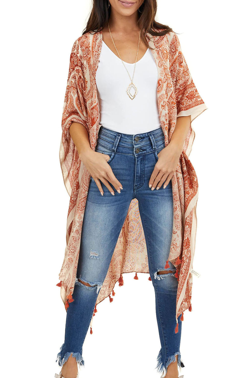 The Sundown Paisley Kimono Cover-Up brings effortless warmth to every escape. Designed in a breezy open-front silhouette, it drapes beautifully over swimwear or soft linen layers. The intricate paisley print in sunlit orange tones captures the glow of golden-hour light, while tassel details along the hem add a touch of relaxed movement.